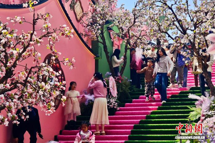 3月22日,祸修祸州,市平易近正在1处用假花打扮的人造制景景面玩耍。中新社记者 王东亮 摄